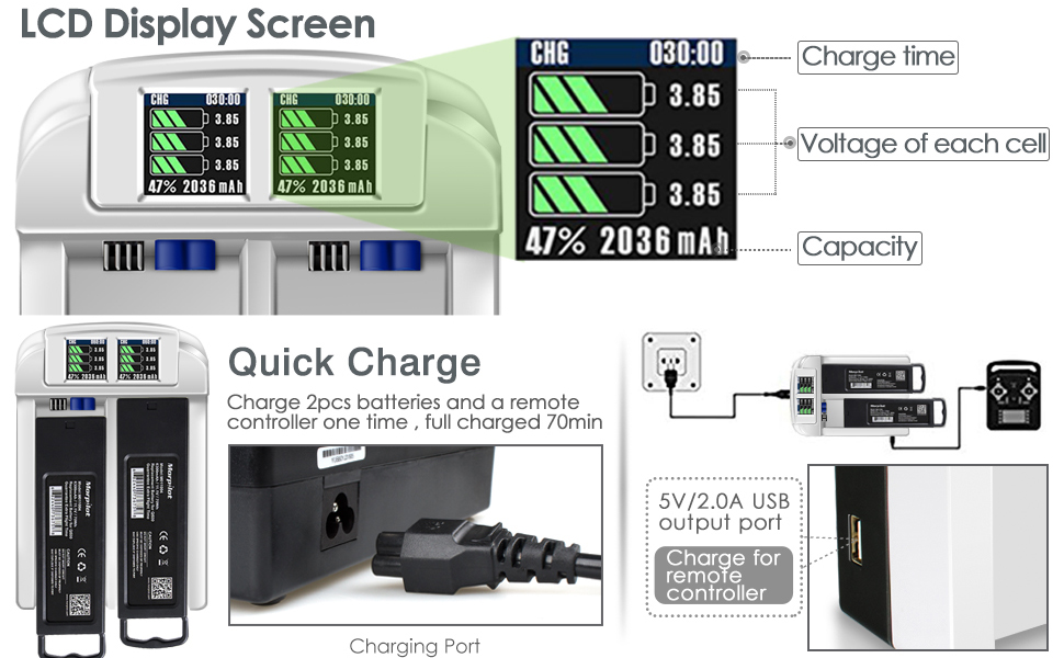 - Support to charge two batteries simultaneously, and optimized charging mode to charge faster
