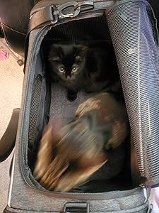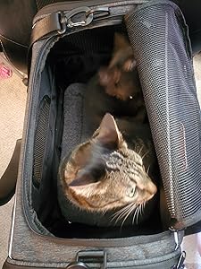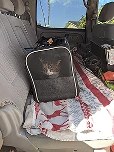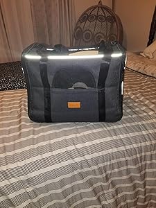 I am a 58-year-old woman who, after many years and many cats, finally had to replace an older cat carrier that gave many cats a fine ride. I found this on Amazon and I am impressed by all the newest features like soft sides, lightweight, mesh windows, a seat belt buckle to fit the car seat, a carrying strap, a wide strap across the back to attach to your rolling suitcase if needed (bonus to me), and a collapsible water bowl. All of this and it folds away in a neat plastic pouch. That all said. I have six cats. If I would get 5 more of these, fold them, and put them all away, they would all take up less space than all my old hard-sided cat carriers. Oh by the way… well made. Thank you. Yes, I will be buying more in the future.