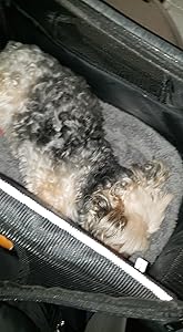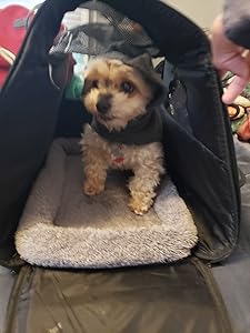 It’s a great size for my toy poodle. Very roomy for a small dog. I love that it comes with a nice pad at the bottom, Velcro’s in and is machine washable. Sturdy, breathable and stylish, my boyfriend likes it too. It’s been a great bag for our pup. I wish it was a bit more see through but other than that still give it 5 stars. That picture is him getting in there on his own! So cute