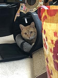 Upon opening there is a strong material smell so i opened it up and let it air out for like a week or so. Now I find Clementine just hanging out in there I don’t think she realizes it’s a carrier and thinks its just another bed. I like this because her last carrier (a hard case) she would only ever be in there when forced for a vet visit or long drive to someplace.Haven’t used this for the vet or any sort of “traveling” like that but I put her in there to move her from one room to the next while there were maintenance people in the house. It is a soft bottom so it does sink when you lift it. The handle doesn’t cut into your hand by design since it is a soft leather of sorts. I put Clam in from the top so that the carrier retains its form while I’m working with the cat. It’s nice that it opens from both ends too (3 total entry points).I keep the carrier out so that Clementine can come hang out when she wants. Every so often I zip up the open door and turn it around so that the carrier keeps shape. The edge of the zip is sort of reinforced so when the “door” is shut its held up very well and when it is open it slightly slouches a bit but is still upright. This shows in the photo better than I can describe.The water bowl looked really cool but I haven’t used it yet. I let that air out and washed it after. If I end up using it I will also wash prior to use. The material smell is very strong here too when you open it.The bed mat inside is very soft and has a zipper so the casing can be washed. The whole thing can be taken out but has velcro in the middle to hold the mat in place. The rough side is on the bottom of the carrier so not ideal for using it without the mat. Wish the rough side of the velcro was on the bottom of the mat instead so it would just be an odd soft spot to lay on when the mat is removed. It has a platform of sorts? Inside the bottom of the mat (for antileak peeing protection I think). Clam really likes how it feels laying on this bed.It isn’t too intimidating for her to approach. Can easily match other luggage type stuff too if that pertains to you.