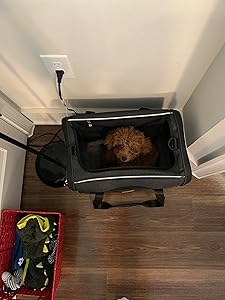 Our dog already had a bag but wanted to upgrade our little princess into something more luxurious. Our mini Pomeranian absolutely loved the space inside this bag. It comes with a cute little water dish and tons of space inside for them to move around and get comfy. The biggest thing about this bag is that it slides right over your luggage so you don’t have to carry them on your shoulder. GAME CHANGER. We wheeled our little girl around the airport with ease, knowing she was snug as a bug in her new bag.